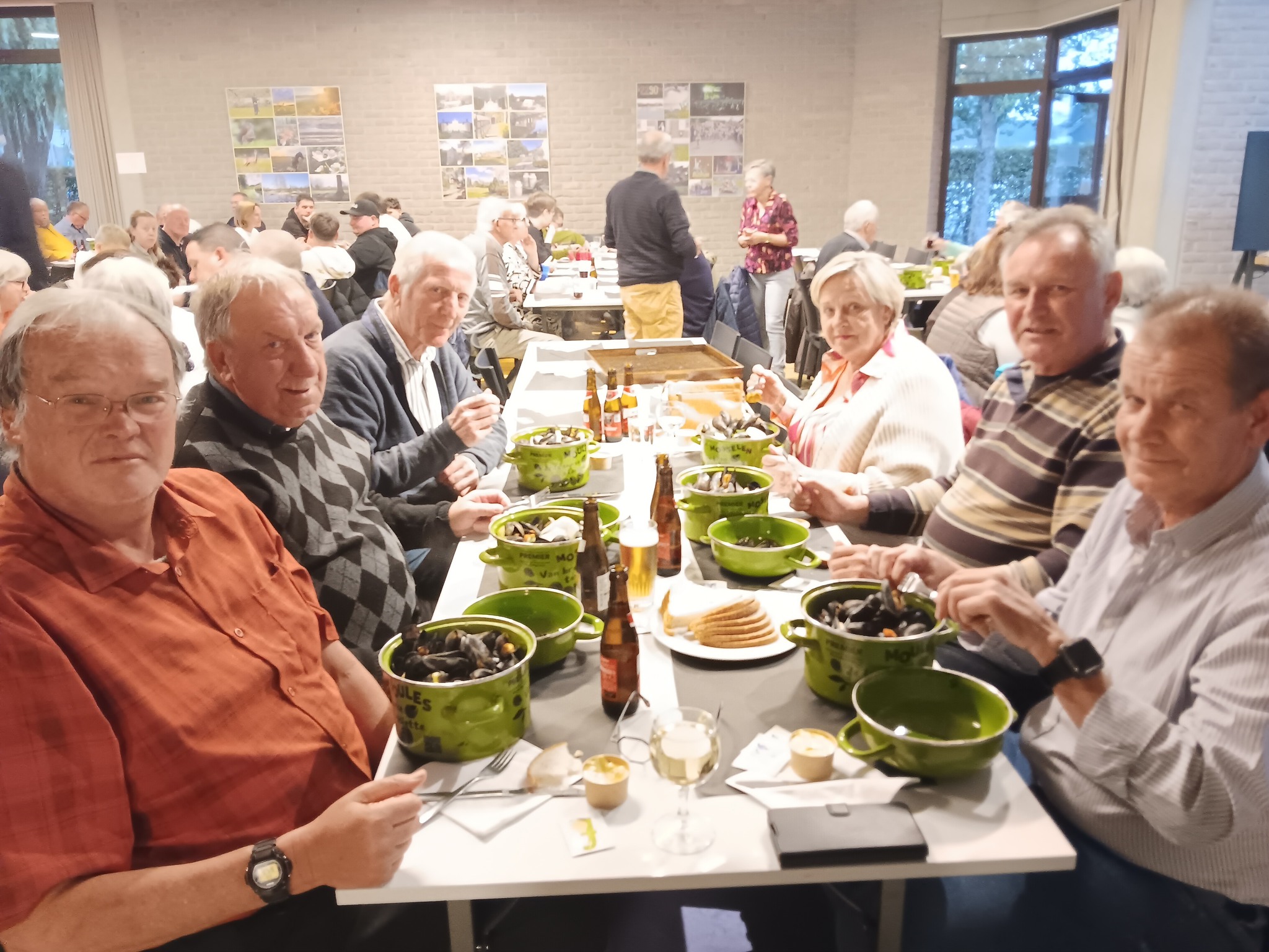 Mosselfeest bij de kring van Herentals. Gust, Fons, Fons, Kris, Paul en Susy smullen van die heerlijke mosseltjes. Smullen maar…..